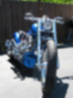 Rolling Thunder frame with a single sided swing arm, 5" stretch, 0 up and 42 degree rake. 6 degree trees, 2" tub frame, tri-bar headlight, blue accent lights, flush mount tail light and hidden turn signals with auto-cancel. High flow air cleaner. Gas, oil, brake lines, and cables are stainless steel braided. Flush gas cap and oil cap, full function digital gage, Patrick 131, dual fire ignition, compression releases, show polish. Baker 6 speed RSD 300 Avon back and 120 Avon in the front. Primo 3 ½ inch open belt drive, Mikuni 45mm carburetor, belt drive, 6 piston front and 4 piston rear break calipers. All chromed out and blue pearl custom paint.